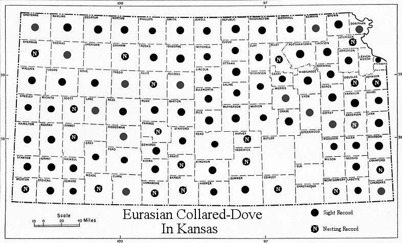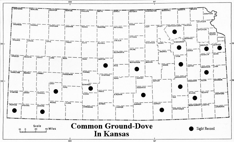 Lloyd Moore has collected and organized the records for various uncommon doves in the state of Kansas. Simply click on the links below for textual data or graphical data (maps). Lloyd (and the Kansas Bird Records Committee would also appreciate it if you could send him sighting records, breeding records, or other observations of any of these species. Hotlinks to Lloyd's email address are found on each page.