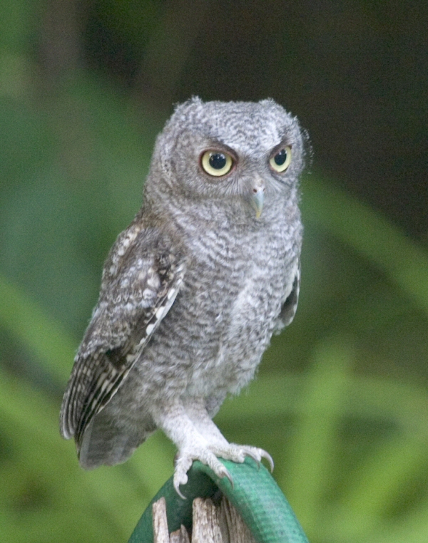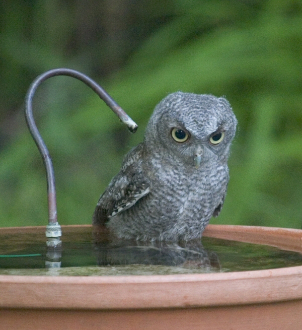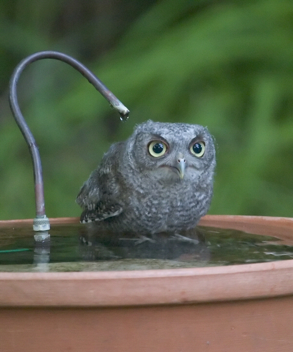 There are some advantages to having a birdbath with a dripper during a hot Kansas summer. I glanced out the window and saw an adult Eastern Screech-owl and two juveniles sitting in the birdbath. By the time I got the camera unlimbered and set for a high ASA (it was 8:20 PM), only one owl was left. But that one proved to be fairly cooperative!
