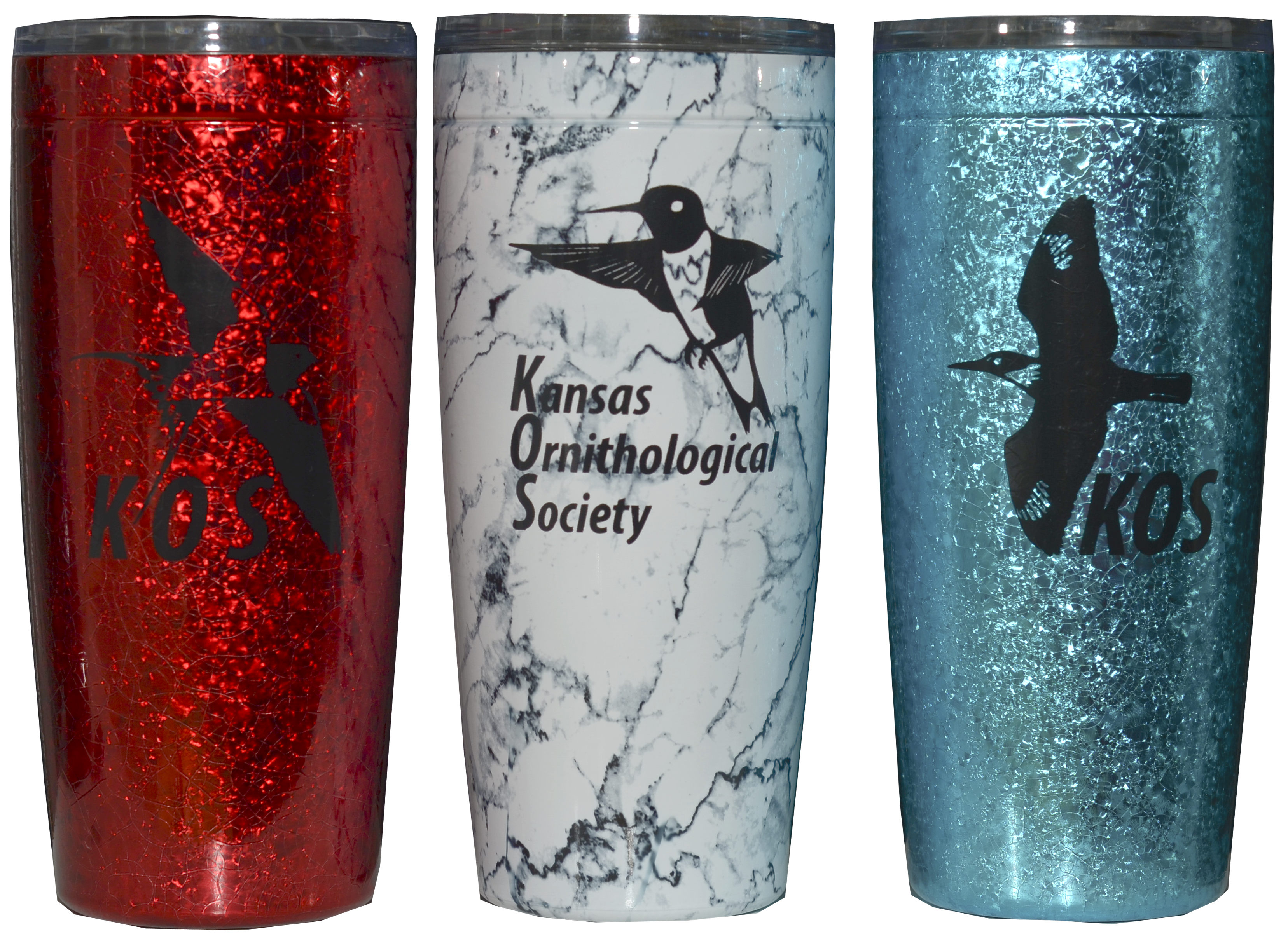 KOS Tumblers - $15 each or all three for $40 - They are double wall stainless steel with copper-lined vacuum insulation that keeps drinks hot or cold for hours. Comes with a clear push-on lid with a twist closure. Select from Sparkle Red (Barn Swallow KOS), Marbled White (Ruby-throated Hummingbird Kansas Ornithological Society) or Sparkle Blue (Belted Kingfisher KOS).