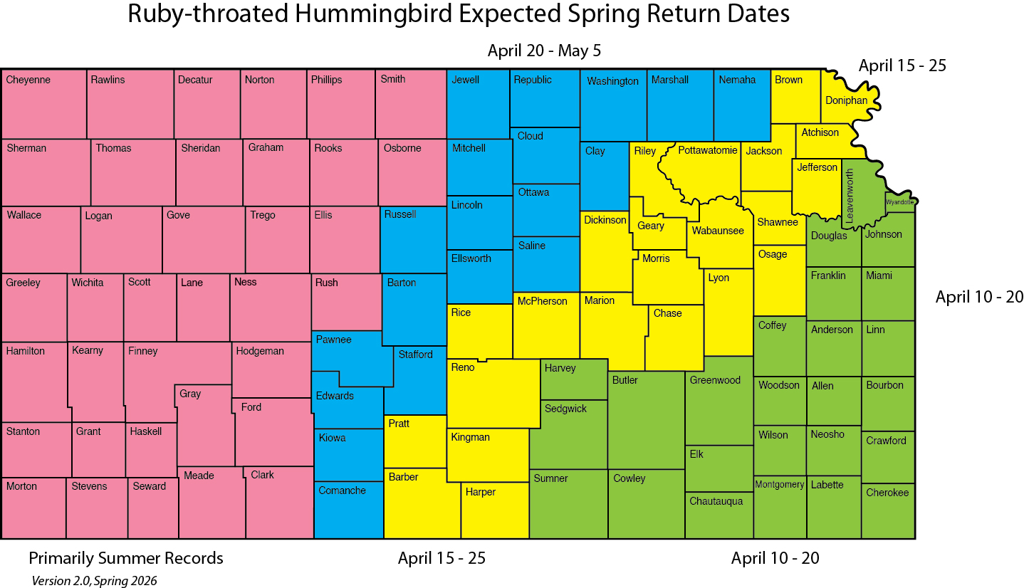 The map below is an attempt to indicate approximately when to put feeders out to attract early migrants (key below the map). Return dates will vary annually based on weather and food supplies. Migrants will continue to arrive and move through the state well into the end of May. Most of the hummingbirds that enter our state boundaries will move on north, as weather allows, to nest. During most of June and early July we will have nesting occurring in Kansas. In late July, southbound migration begins and lasts into early October (this is also when the less common western species will wander south through Kansas. Even if you have no hummingbirds during June (indicating that they are not nesting near your yard/feeders) be sure to have feeders cleaned up and filled by late July. A lot of time was spent analyzing Ruby-throated Hummingbird, mainly from eBird, in late winter 2026. First return records were evaluated from 2020 through 2025 and that information was used to refine, update and simplify the map for spring 2026. Return dates vary from year to year and the map below takes into account earliest return dates over the past six years along with average return dates in that same time frame. The map is intended to help those who put up hummingbird feeders, for Ruby-throated Hummingbirds, know about when to put them up. I would suggest putting one up on, or within a day or two, of the early dates shown for your county. Put minimal amount of nectar (4 parts water, 1 part pure white granulated sugar, no dye and no other additives) in the feeder until the hummingbirds show up and then adjust as intake requires. Please log your first arrival dates in eBird or send that date to me for future updates and revisions to the maps.